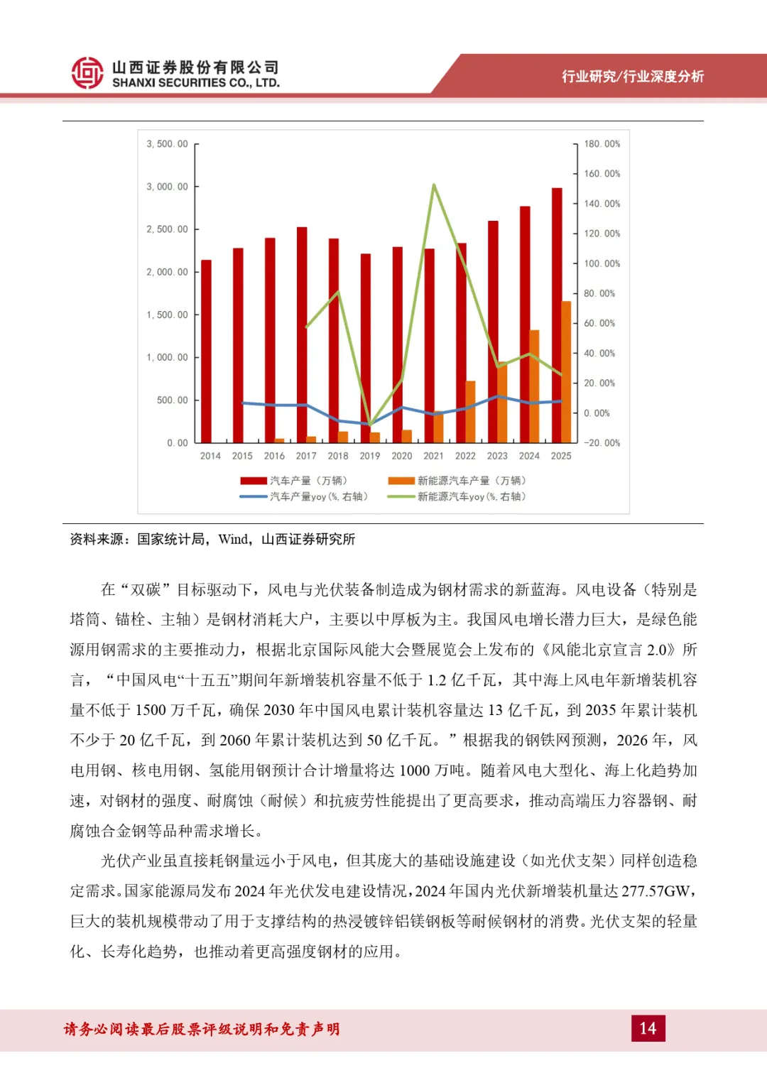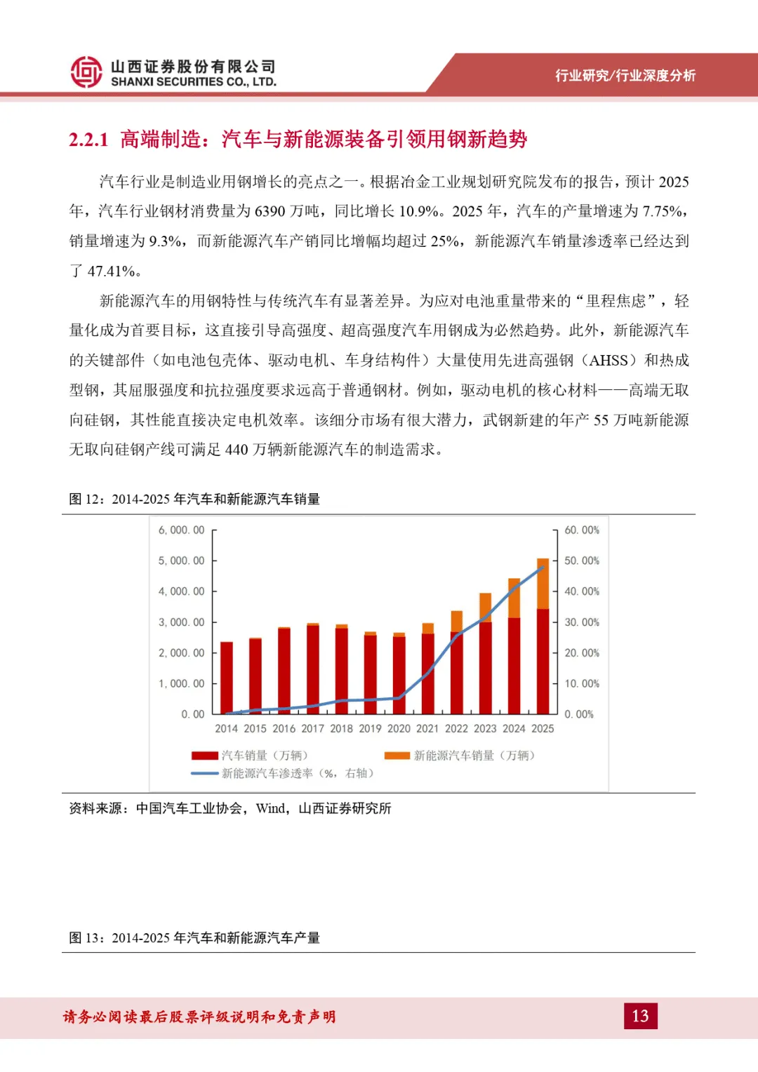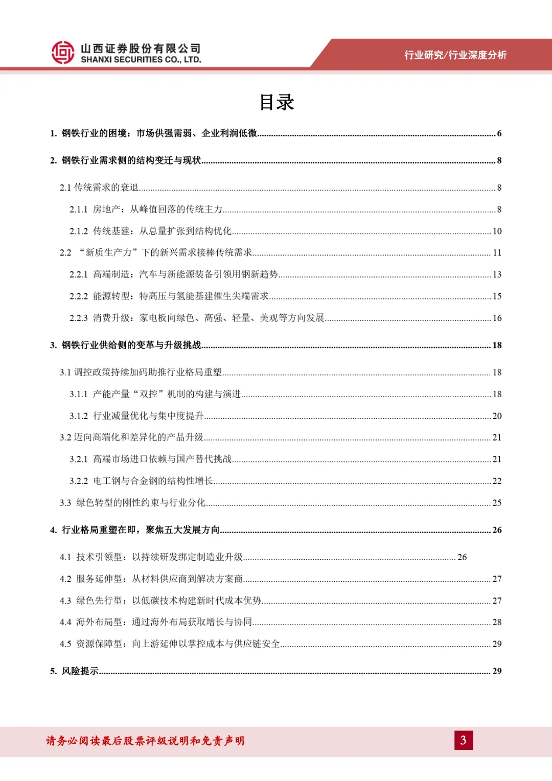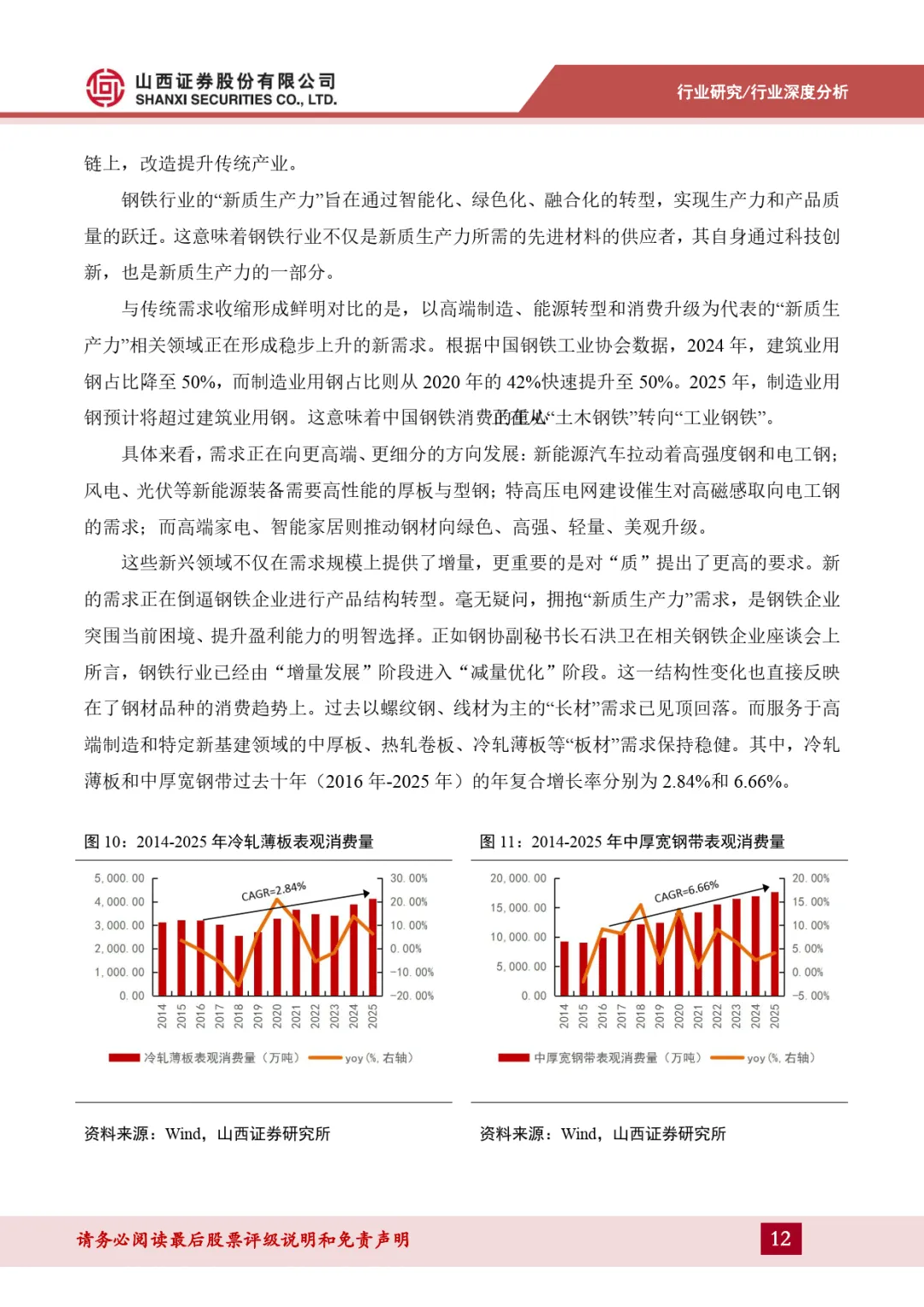 2026 年 2 月山西证券发布的钢铁行业深度报告指出,当前钢铁行业深陷 “三高三低” 困境,核心矛盾为需求趋势性下滑与供给调整刚性的结构性错配,2024 年行业重点企业平均销售利润率跌至 0.71% 历史低位,2025 年虽回升至 1.9% 但仍处低位。供给端因高炉停炉成本高、企业摊薄固定成本动机及地方政府支持,粗钢产量维持在 9.6-10.7 亿吨;需求端房地产作为传统用钢主力持续下行,2025 年房地产用钢占比预计降至 23%,传统基建增速放缓,仅作为需求 “压舱石”。————