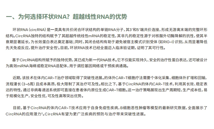 在肿瘤免疫治疗持续突破的当下,多种体内细胞疗法正从概念走向现实,而环状RNA(circRNA)技术,已经成为体内浪潮的关键支点。