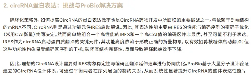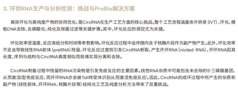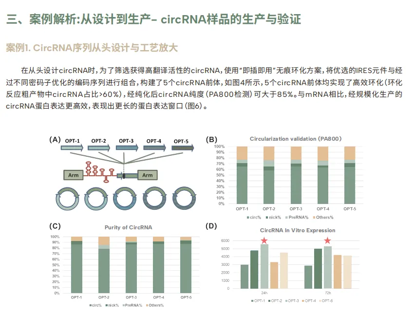 白皮书中蓬勃生物的CircRNA平台从序列设计,工艺优化,质量控制构建了“三位一体”的技术体系,以序列设计确保效能及安全性,以工艺优化保障产品纯度与稳健的工艺放大,以严谨的分析质控策略进行多维度产品表征、功能性及安全性验证。