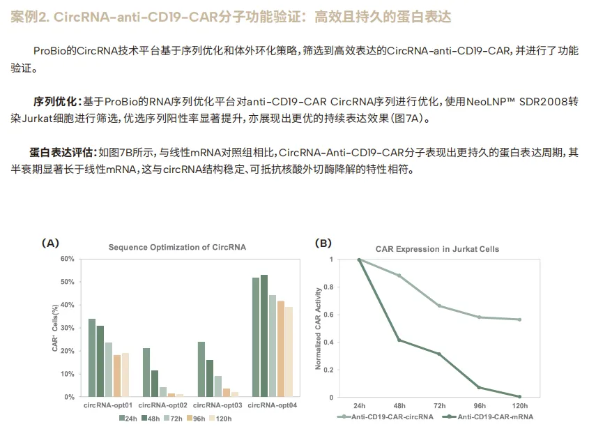 circRNA因其共价闭合环状结构,比线性mRNA更稳定,能在体内持续表达CAR蛋白数天至数周,显著延长抗肿瘤效应。