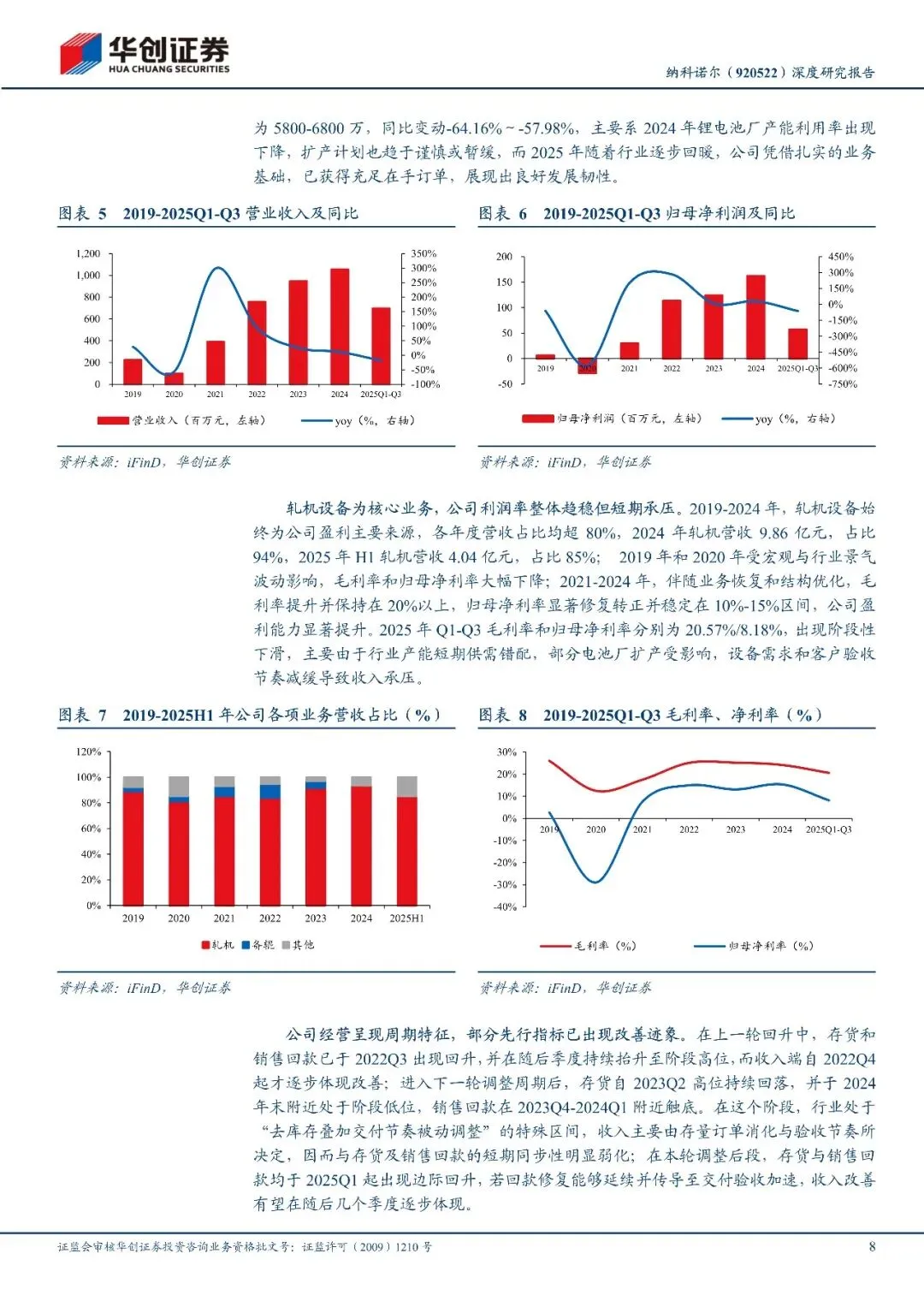 锂电池前道设备行业领先,业绩拐点将至。纳科诺尔成立于20100年,是国内领先的电池极片辊压设备制造商,核心产品为极片棍压机、混压分切一体化设备,并向钠电、补锂、干法等新工艺及高分子材料、碳纤维等多元场景延伸客户覆盖宁德时代、比亚迪、海辰储能、亿纬锂能、松下等国内外主流电池厂商,有望受益新一轮电池企业的资本支出释放。公司2025年前三季度受需求与验收节奏影响,短期业绩承压,但是库存与回款等先行指标已出现边际改善,业绩拐点将至。