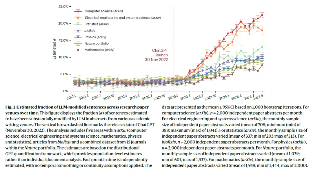 领域分布:AI/ML 领域占据绝对主流(64.3%),但在数学(15 篇)、物理(10 篇)、生物、天文学及经济学等基础科学领域的渗透亦十分显著。