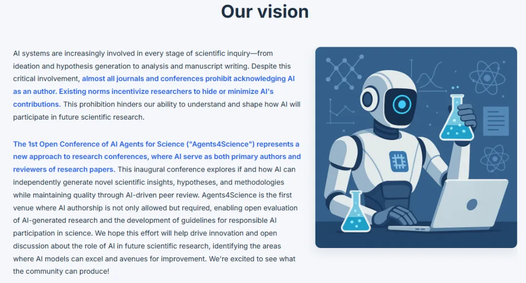 许多根本性问题尚未解答:AI 科学家智能体究竟有多大的创造力?人类研究者应如何与它们协作?大语言模型在评审科学工作方面的能力又如何?这些问题之所以难以深入研究,是因为目前大多数期刊和会议明令禁止将 AI 列为共同作者,也不允许使用大语言模型担任审稿人,而且研究人员往往对其使用 AI 的方式秘而不宣。为填补这一空白,作者组织了 Agents4Science 会议——这是首个允许 AI 智能体同时担任作者和审稿人的学术会议,人类研究者则作为共同作者及补充审稿人参与其中。(本文的五位作者均为该会议的共同组织者。)此次会议为作者提供了一个探索 AI 驱动科研未来的重要契机。