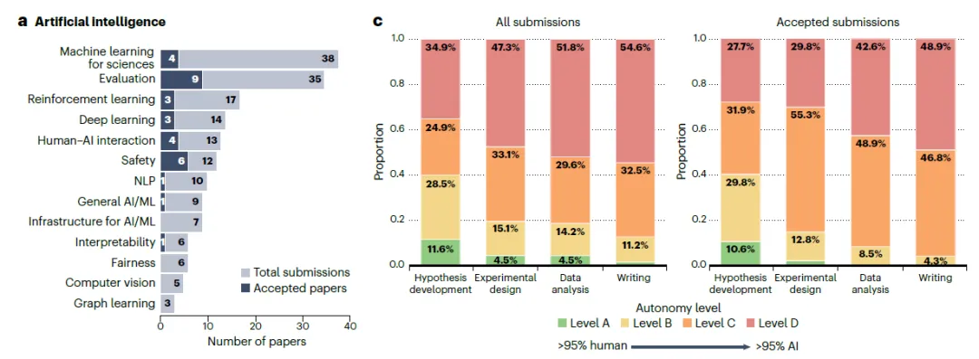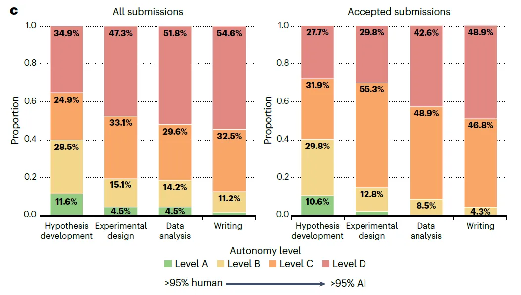 假设生成(Hypothesis development):人类控制力最强。录用论文中达到 D 级(全 AI 驱动)的比例仅为 27.7%,人类在定义核心科学问题上仍发挥主导作用。