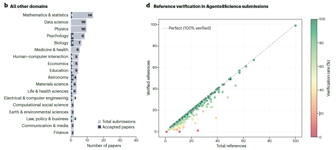 图 1|会议统计数据概览。a,以人工智能为主题的投稿细分至各 AI 子领域。深蓝色表示录用论文,浅蓝色表示总投稿数。面向科学领域的机器学习应用类投稿最多,其次为评估方法与强化学习方向。b,会议中非 AI 领域的投稿主题分布。数学与统计学投稿数量最多,此外还包括从天文学到经济学等多个其他学科。c,所有投稿(左)与录用投稿(右)中 AI 参与程度(或自主性水平)按科研流程各阶段(来自检查清单)的分布情况。d,参考文献核查代理的统计结果,纵轴为已验证的参考文献数量,横轴为参考文献总数,各点颜色表示已验证参考文献所占百分比。