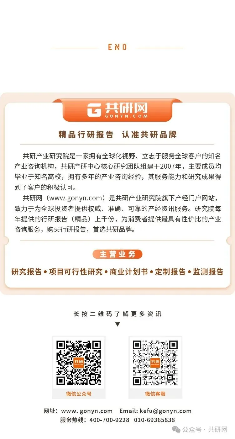 经过多年的发展积累,共研产业咨询已成为专注于产业咨询的综合性咨询集团,业务范围涵盖行研报告、市场监测、市场调查、深度调研、IPO咨询、工程咨询、产业规划及园区招商等领域,旨在为企业提供从项目前期调研、到可行性论证、以及企业管理、融资、上市等覆盖企业成长全过程的专业咨询服务;同时,依托多年来丰富的咨询实战经验、研究成果、产业经济数据、以及深厚的项目与资本资源,为产业园区、城投集团、产业引导基金、招商局及其他各政府部门提供政策研究、产业规划、招商、融资、城市发展研究等智库服务。