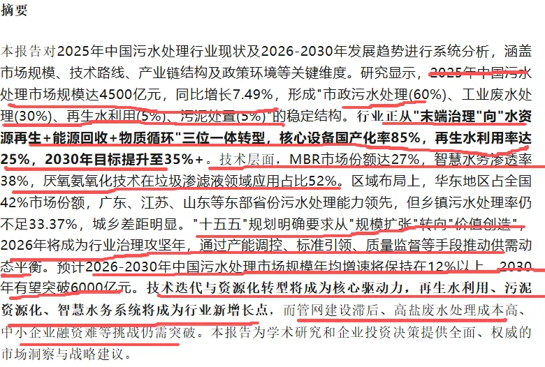 2026年3月份新出炉的《中国污水处理行业市场调查报告》可以说是咱污水处理行业的晴雨表,过去5年及未来5年的发展趋势描述的非常扎实,“没有正确的调查就没有发言权”,只有详尽了解真实的污水处理现状,对整个行业的趋势进行有效把控,我们要有“自信人生二百年,会当水击三千里”信心,更要有“为有牺牲多壮志,敢教日月换新天”的斗志才能在未来水处理的发展中在“已是悬崖百丈冰”的艰难条件下去把握那“犹有花枝俏”的机会。好了,长话咱就短叙,我们直接上图片:可以看出,2025年中国污水处理市场规模达4500亿元,同比增长7.49%。整个大环境没有想象中的那么糟糕啊,最起码行业还是向前发展的。已经形成形成"市政污水处理(60%)、工业废水处理(30%)、再生水利用(5%)、污泥处置(5%)"的稳定结构,按照污染物的浓度和处理要求,规模化养殖废水已经纳入工业废水处理的领域。行业正从"末端治理"向"水资源再生+能源回收+物质循环"三位一体转型,核心设备国产化率85%,再生水利用率达25%,2030年目标提升至35%+。技术层面,MBR市场份额达27%,智慧水务渗透率38%,厌氧氨氧化技术在垃圾渗滤液领域应用占比52%。这表明未来咱水处理人的技术及研发方向——国产替代、再生水领域、智慧水务、MBR、当然还有咱菌种及其技术服务的梦想——厌氧氨氧化方向。"十五五"规划明确要求从"规模扩张"转向"价值创造",2026年将成为行业治理攻坚年,通过产能调控、标准引领、质量监督等手段推动供需动态平衡。这就要求咱水处理人要转变观念,莫在盲目追大,要从原来的建造思维,转变成以“运营”的投资思维,要有现金流的意识。预计2026-2030年中国污水处理市场规模年均增速将保持在12%以上,2030年有望突破6000亿元。技术迭代与资源化转型将成为核心驱动力,再生水利用、污泥资源化、智慧水务系统将成为行业新增长点,而管网建设滞后、高盐废水处理成本高、中小企业融资难等挑战仍需突破。机遇与风险同在,如何在风险中把控机会,如何在把控机遇的同时把风险降低到可控范围内是水处理胖老程,乃至每一个环保人都应该思考的。