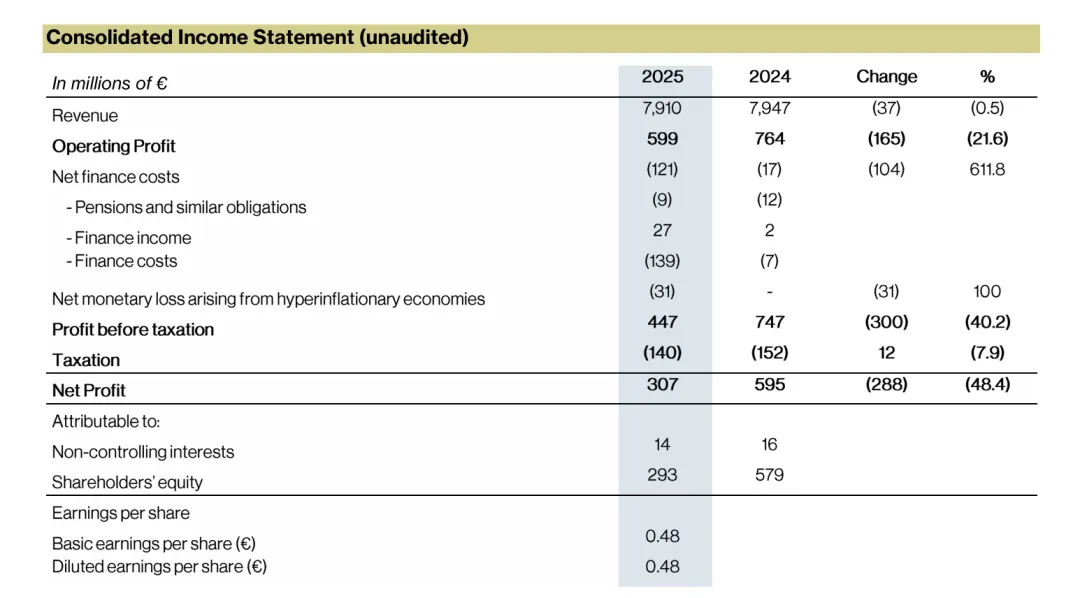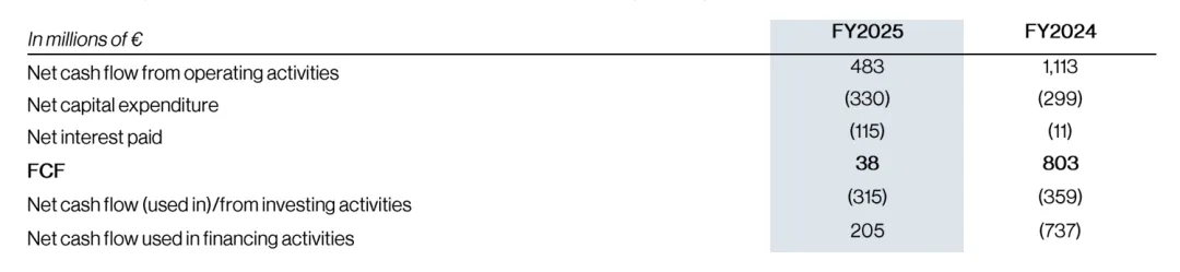 对于全年净利润的大幅下滑,梦龙方面在财报中作出明确说明,称报告期内净利润承压,主要受分拆上市相关的财务成本增加、全球汇率波动带来的汇兑损失等多重因素的综合拖累。而在净利润近乎腰斩之外,公司现金流端的表现更引发了市场的重点关注。财报数据显示,2025 年全年,梦龙的自由现金流仅为 3800 万欧元,相较于 2024 年同期 8.03 亿欧元的规模,同比暴跌幅度达到 95%,出现了断崖式的收缩。