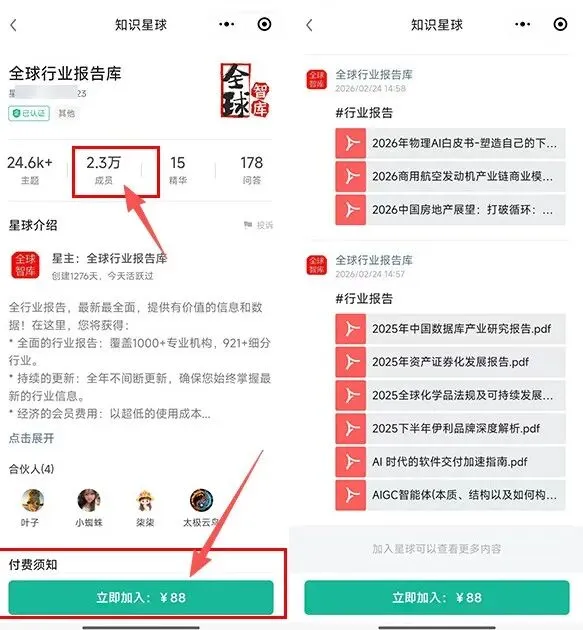 它的运营思路挺简单的。首先在知识星球创建一个付费圈子,接着在圈子里持续更新各行业报告,一边更新资料,一边进行推广来获取客户。