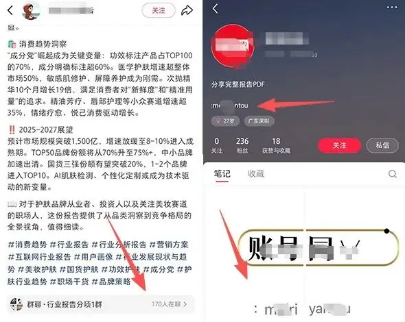 发笔记的时候,直接截图资料内容展示,展示一部分,留一部分悬念。然后在账号主页或者笔记下方挂一个群聊,有需要资料的人自然就会来找你。
