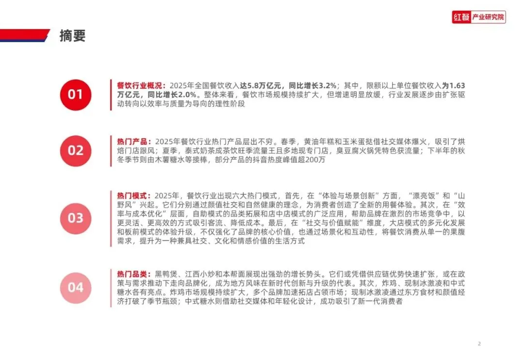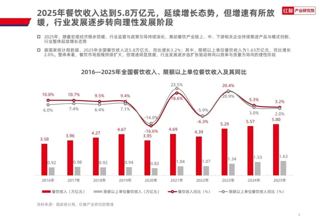 2025年,全国餐饮收入达5.8万亿元,同比增长3.2%,增速有所放缓。限额以上单位餐饮收入为1.63万亿元,同比增长2.0%。整体来看,餐饮行业已从过去的规模扩张转向以效率与质量为核心的理性发展阶段。
