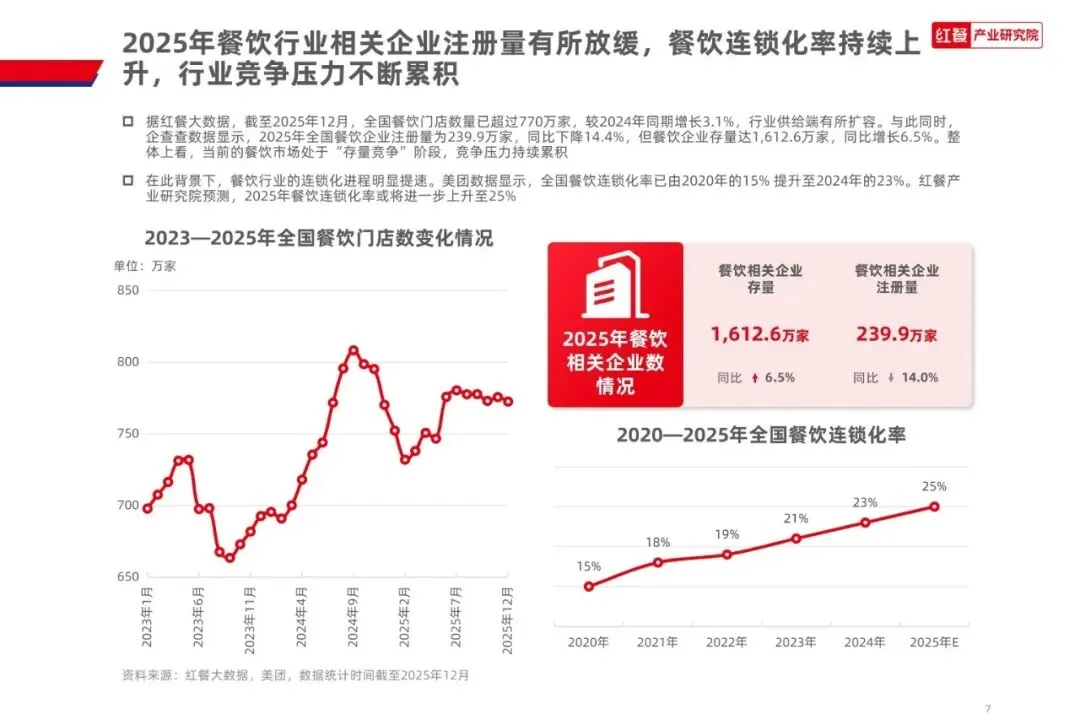 ⦁ 餐饮门店数量持续增加,已超770万家,但企业注册量同比下降14.4%,行业进入存量竞争阶段。连锁化率持续提升,预计2025年将达到25%。