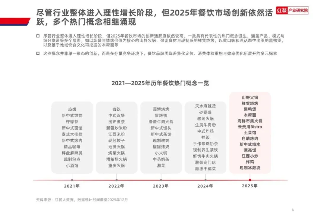 ⦁ 尽管增速放缓,市场创新依然活跃。2025年涌现出一批以场景、情绪、食材为核心的热门概念,如山野火锅、鲜货烧烤、黑鸭煲、本帮面等,反映出品牌在差异化、体验重构和效率优化方面的多元探索。