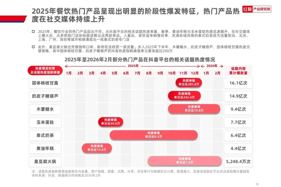 2025年,餐饮热门产品呈现出明显的阶段性爆发特征,社交媒体成为热度发酵的主阵地。春季黄油年糕、玉米蛋挞走红,夏季泰式奶茶、臭豆腐火锅接棒,秋冬则由木薯糖水、奶皮子糖葫芦等接力,部分产品抖音热度峰值超200万。