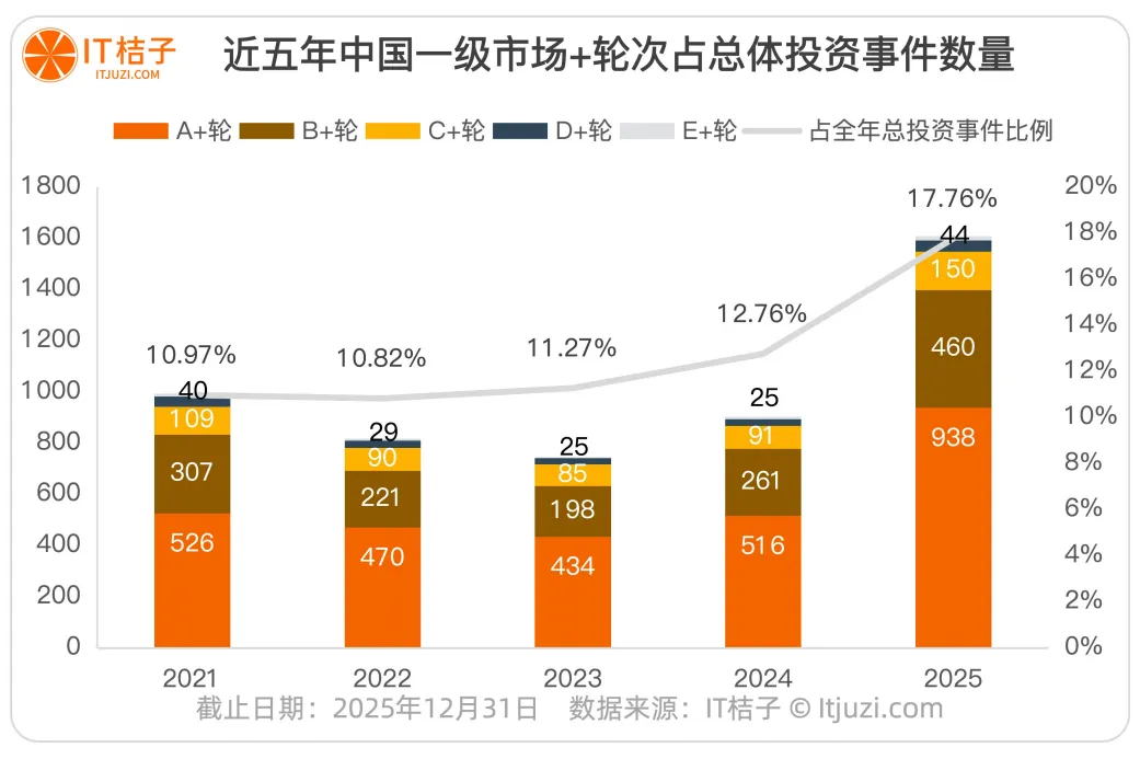 2025年,“+轮”融资占全年投资的17.8%,平均每6笔就有1笔是“+轮”。