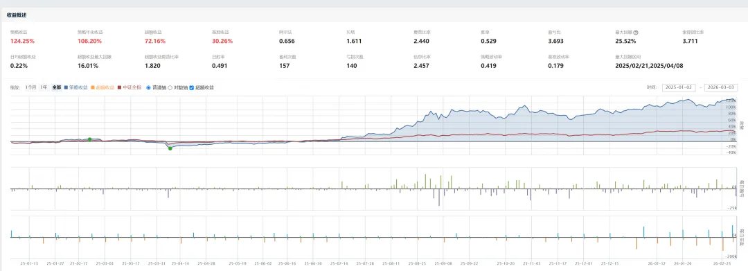 def rebalance_portfolio(context):"""核心投资组合再平衡函数"""# 1. 获取当前总资产total_value = context.portfolio.total_valueif total_value <= 0:log.error(f"总资产为 {total_value},无法调仓。")returnlog.info(f"当前总资产: {total_value:.2f}")# 2. 获取前一个交易日(避免未来数据问题)# 在开盘前,我们只能使用前一天的数据trade_days = get_trade_days(end_date=context.current_dt, count=2)if len(trade_days) < 2:log.error("无法获取足够的交易日数据")returnprev_date = trade_days[-2] # 前一个交易日# 3. 第一阶段:指数动量轮动(使用前一日数据)index_momentum = {}for index_code in g.index_list:try:# 使用前一个交易日作为结束日期index_df = get_price(index_code,count=g.index_momentum_period+1,end_date=prev_date,frequency='daily',fields=['close'])if index_df is None or len(index_df) < 2:continuestart_price = index_df['close'].iloc[0]end_price = index_df['close'].iloc[-1]momentum = (end_price / start_price) - 1index_momentum[index_code] = momentumexcept Exception as e:log.warning(f"计算指数 {index_code} 动量失败: {e}")continueif not index_momentum:log.warning("所有指数动量计算失败,使用备用选股。")final_stocks = get_fallback_stocks(context, prev_date)else:# 选择动量最强的指数sorted_indices = sorted(index_momentum.items(), key=lambda x: x[1], reverse=True)selected_indices = [item[0] for item in sorted_indices[:g.top_index_count]]log.info(f"本期强势指数: {[g.index_dict.get(c, c) for c in selected_indices]}")# 4. 第二阶段:从强势指数中选股all_candidate_stocks = []for idx_code in selected_indices:# 获取指数成分股(使用前一日数据)idx_stocks = get_index_stocks(idx_code, date=prev_date)if not idx_stocks:continue# 对指数内股票进行可交易性初筛tradable_in_index = filter_stocks_basic(context, idx_stocks, prev_date)if len(tradable_in_index) < 5:continue# 计算Beta并选股selected_from_index = select_high_beta_stocks(context, tradable_in_index, idx_code, prev_date)if selected_from_index:all_candidate_stocks.extend(selected_from_index)log.info(f" 指数 {g.index_dict.get(idx_code, idx_code)} 贡献 {len(selected_from_index)} 只候选股。")if not all_candidate_stocks:log.warning("指数选股未得到候选股,使用备用选股。")final_stocks = get_fallback_stocks(context, prev_date)else:# 对候选股进行最终可交易性确认final_stocks = confirm_tradable_stocks(context, all_candidate_stocks, total_value, prev_date)if not final_stocks:log.warning("候选股可交易性确认失败,使用备用选股。")final_stocks = get_fallback_stocks(context, prev_date)# 5. 执行调仓if final_stocks:execute_rebalance(context, final_stocks, total_value, prev_date)else:log.error("最终选股列表为空,无法调仓。清空现有持仓。")clear_all_positions(context)