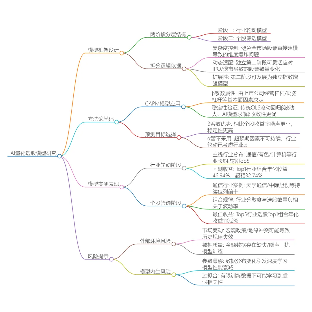 AI量化选股模型采用两阶段选股逻辑:第一阶段为行业主线轮动模型,聚焦宏观与行业层面,对行业指数趋势强弱进行预测与排序;第二阶段在预测的主线行业内,运用AI量化选股模型,基于个股基本面特征因子完成最终标的筛选。 第二阶段模型的预测目标是个股相对于行业组合的β系数排序,通过选择β系数相对更大的股票,借助其与市场组合的高联动性获取更高的个股收益率。 模型采用两阶段划分的主要原因包括控制模型复杂度、动态适配上市公司数量变化以及选股第二阶段模型可以独立发展成为指数增强模型。