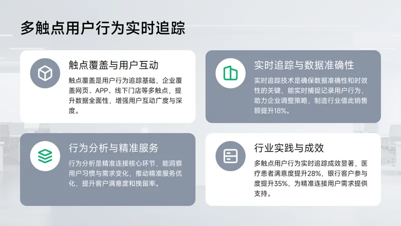 从行业实践来看,多触点用户行为实时追踪已取得显著成效。在医疗行业,优化流程和推送机制后,患者满意度提升了28%,体现了行为数据在提升服务质量方面的价值。银行智能营销平台通过AI驱动技术,在触点管理中实现了客户参与度35%的提升,进一步验证了实时追踪和行为分析的重要性。