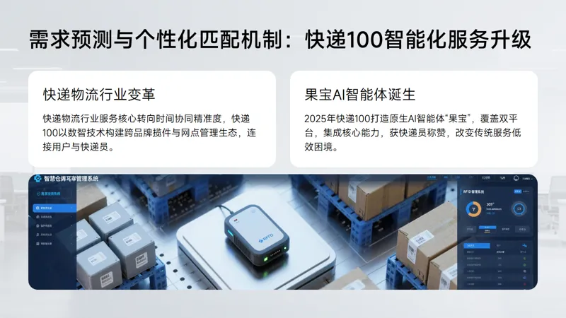 需求预测基于用户画像和行为数据,通过算法分析用户未来需求的可能变化,提高连接的主动性。快递100以数据驱动优化末端服务链路,通过智能调度与高效沟通工具,精准匹配用户需求与快递员作业节奏。例如,其AI智能体“果宝”通过集成智能问答和知识学习能力,实现了对用户取件预约和快递员智能调度的精准协同,从根源上破解末端沟通不畅的行业痛点。