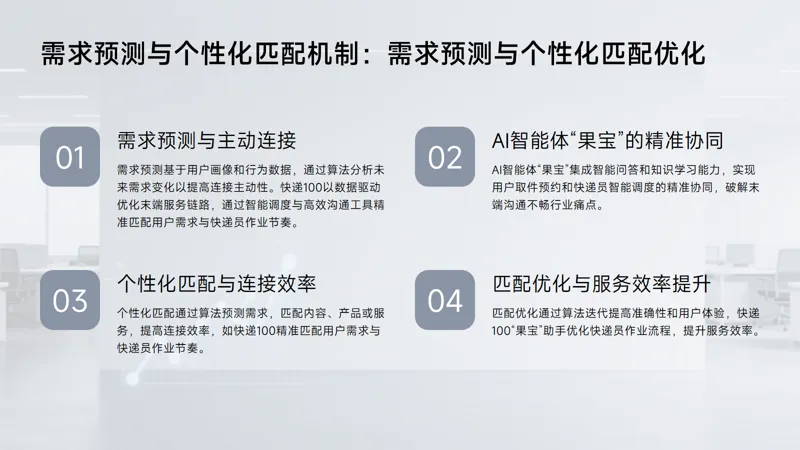 个性化匹配根据需求预测结果,通过算法实现个性化内容、产品或服务匹配,提高连接效率。快递100通过智能调度与高效沟通工具,精准匹配用户需求与快递员作业节奏,让每一次取件都精准高效。匹配优化不断通过算法迭代提高准确性和用户体验,例如快递100的“果宝”助手通过功能跳转和知识学习能力,优化了快递员作业流程,提升了服务效率。