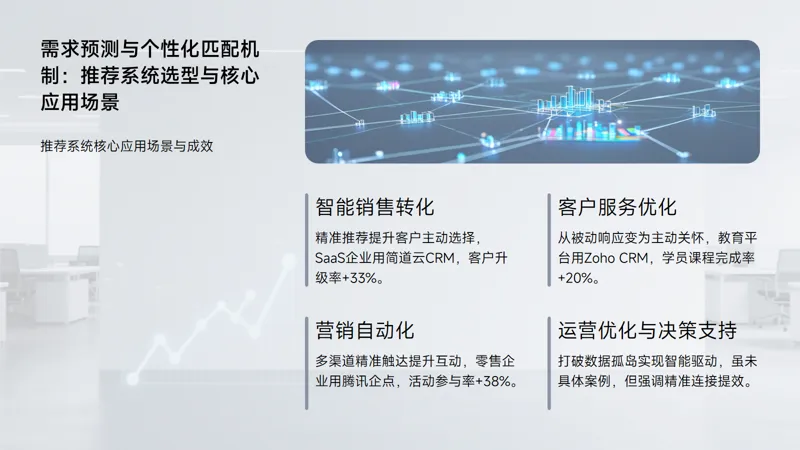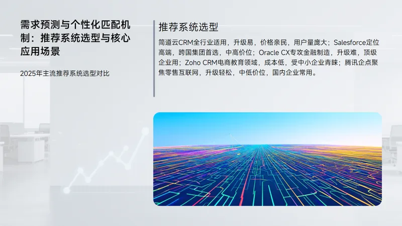 在推荐系统核心应用场景与成效方面,智能销售转化的核心价值为精准推荐提升客户主动选择,典型案例为某SaaS企业使用简道云CRM,效果提升为客户升级率提升33%;客户服务优化的核心价值为从被动响应变为主动关怀,典型案例为某在线教育平台使用Zoho CRM,效果提升为学员课程完成率提升20%;营销自动化的核心价值为多渠道精准触达提升互动,典型案例为某零售企业使用腾讯企点,效果提升为活动参与率提升38%;运营优化与决策支持的核心价值为打破数据孤岛实现智能驱动,典型案例为--,效果提升为--。这些数据进一步印证了精准连接和个性化匹配在提升行业效率中的关键作用。