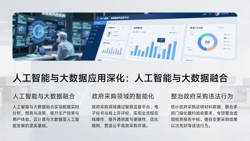 人工智能与大数据融合实现了数据的实时分析、预测与决策,显著提升生产效率与用户体验。云计算提供平台支撑,大数据提供素材基础,深度学习得以迅速发展。云计算与大数据共同构成人工智能前进的坚实基础。在政府采购领域,通过建立智能监管平台、推广电子标书与线上开评标,可实现全流程在线操作,提升透明度与便捷性。同时,优化电子招投标规则,增强流程规范性,营造更加公平、高效的采购环境。统计全国政府采购检测报告等证明材料数据,联合市场监管、公安等部门,可从严细化履约验收要求,专项整治提供虚假检测报告谋取中标和擅自变更采购结果以次充好等违法行为。