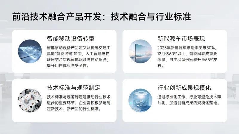 以智能移动设备为例,其产品定义正从传统交通工具向“智能终端”转变。人工智能与物联网的结合,使车辆能够实现智能网联与自动驾驶功能,显著提升用户体验与安全性。2023年,新能源车渗透率突破50%,并于12月达到60%以上,其中智能网联功能成为消费者选择的重要考量因素。自主品牌市场份额攀升至65%左右,反映出技术融合对产品竞争力的直接拉动。