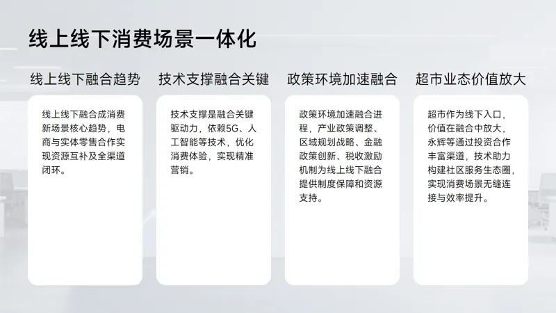 超市业态作为重要线下入口,其价值在融合中被放大。永辉超市通过投资中百集团、联华超市丰富渠道资源,并与京东合作入驻“京东到家”,提供社区生活服务。移动互联技术和大数据助力构建社区生活服务生态圈,使线下网点和供应链资源发挥更大效能。整体而言,线上线下融合通过技术应用、政策支持和业态协同,实现了消费场景的无缝连接与效率提升。