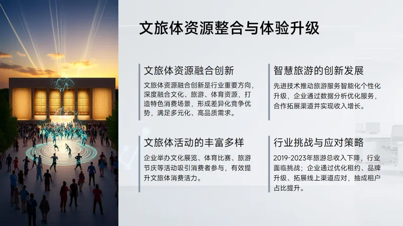 文旅体资源的整合与体验升级不仅提升了企业的经营效率,也为行业转型提供了新路径。未来,随着技术应用和业态创新的不断深化,文旅体消费场景将进一步丰富,推动行业向高质量方向发展。