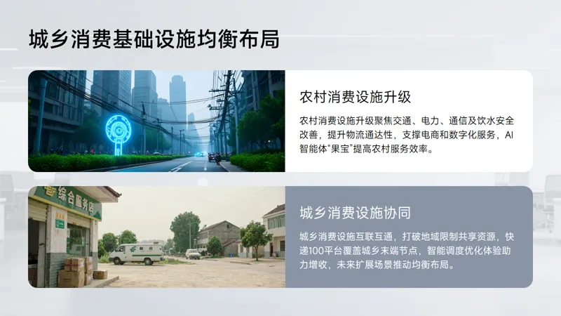 农村消费设施建设方面,重点聚焦于交通、电力、通信及饮水安全等基础环节的改善。农村公路网络的扩展显著提升了物流通达性,而电力与通信设施的升级则为农村电商和数字化服务提供了支撑。例如,快递100平台依托全链路资源优势,服务超3亿个人用户及超250万企业客户,其末端网络覆盖从城市延伸至农村地区,通过技术手段实现资源高效配置。2025年,快递100基于百递云GPT大模型开发的原生AI智能体“果宝”,进一步提升了农村地区的服务效率,集成智能问答与调度功能,成为快递员群体的重要辅助工具。