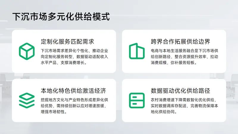 综上,下沉市场供给优化需以数据为基、以需求为导向,通过定制化、跨界融合与本地化特色三大路径,实现供给质量与消费体验的双重提升,为县乡经济注入持续动力。