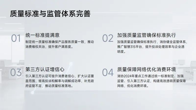 质量标准与监管体系的完善是一个多维度、系统化的工程。消协2024年的重点工作通过具体措施和预期效果,为这一体系提供了数据支撑和操作范例。统一标准的制定、监管力度的加强以及第三方认证的引入,共同构成了一个高效、透明的质量保障网络,为消费环境的优化和制度保障的强化奠定了坚实基础。