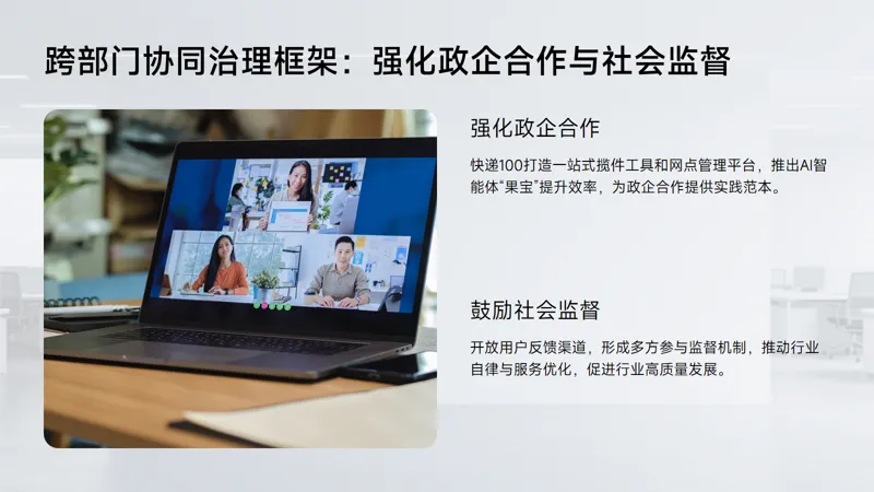 鼓励社会监督,构建多元共治格局。通过开放用户反馈渠道(如快递100服务的超3亿个人用户和250万企业客户),形成消费者、媒体等多方参与的监督机制,推动行业自律与服务优化。数据显示,末端服务效率提升可显著降低投诉率,进而促进行业高质量发展。