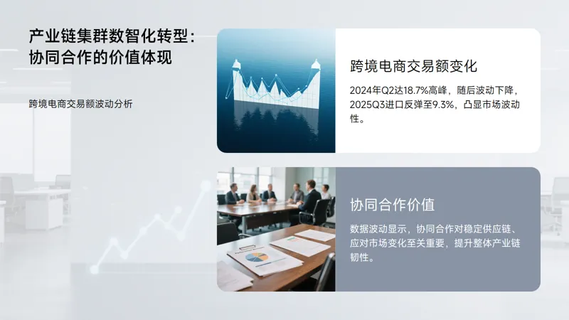 协同合作加强是提升产业链整体竞争力的重要途径。通过强化上下游企业间的资源共享与优势互补,供应链生态的韧性和灵活性得到增强。以跨境电商为例,2024年跨境电商进出口交易额累计同比增速从第一季度的9.6%上升至第二季度的13.0%,第三季度小幅回落至11.5%,第四季度降至10.8%。2025年第二季度增速为5.7%,第三季度回升至6.4%。出口交易额在2024年第二季度达到18.7%的高点,第三季度降至15.2%,2025年第二季度为4.7%,第三季度回升至6.6%。进口交易额在2024年第二季度为-3.9%,第三季度改善至-0.4%,2025年第二季度反弹至9.3%,第三季度降至5.9%。这些数据凸显了协同合作在应对市场波动和提升供应链稳定性方面的价值。