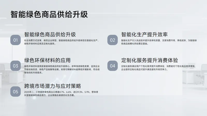 综上,智能绿色商品的供给升级需依托智能化生产、绿色材料应用和定制化服务三大支柱,结合政策支持与市场趋势,推动商贸企业向服务型消费综合体转型。