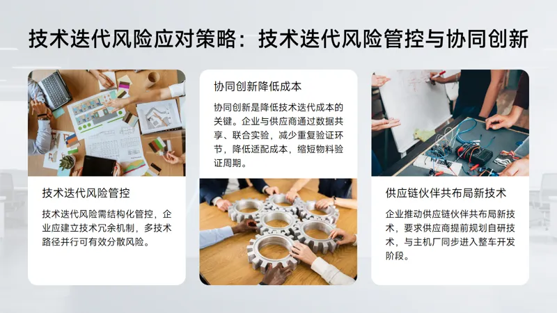 协同创新是降低技术迭代成本的关键。通过数据共享与联合实验,企业与供应商可减少重复验证环节。例如在6C高压系统开发中,供应商早期参与前置化开发可降低后期适配成本,同时缩短物料验证周期。企业需推动供应链伙伴共同布局新技术,例如要求供应商提前规划自研技术,并与主机厂同步进入整车开发阶段。