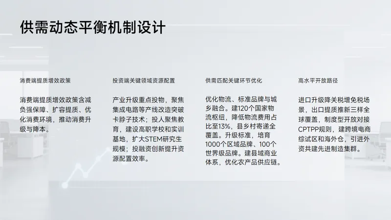 基于以上数据,企业需深入理解用户需求,通过市场调研和反馈机制收集数据,为供需平衡提供支持。灵活调整策略需结合消费端扩容提质措施,如新能源汽车下乡和绿色智能家电以旧换新,以优化产品性能和价格。建立协作伙伴关系可借鉴投资端产教融合实训基地2000个和物流枢纽120个的建设经验,通过共享资源和创新实现共赢。最终,供需动态平衡机制需整合政策量化目标,如县域商业体系1000个示范县和物流费用占比降至13%,确保策略与行业趋势一致。