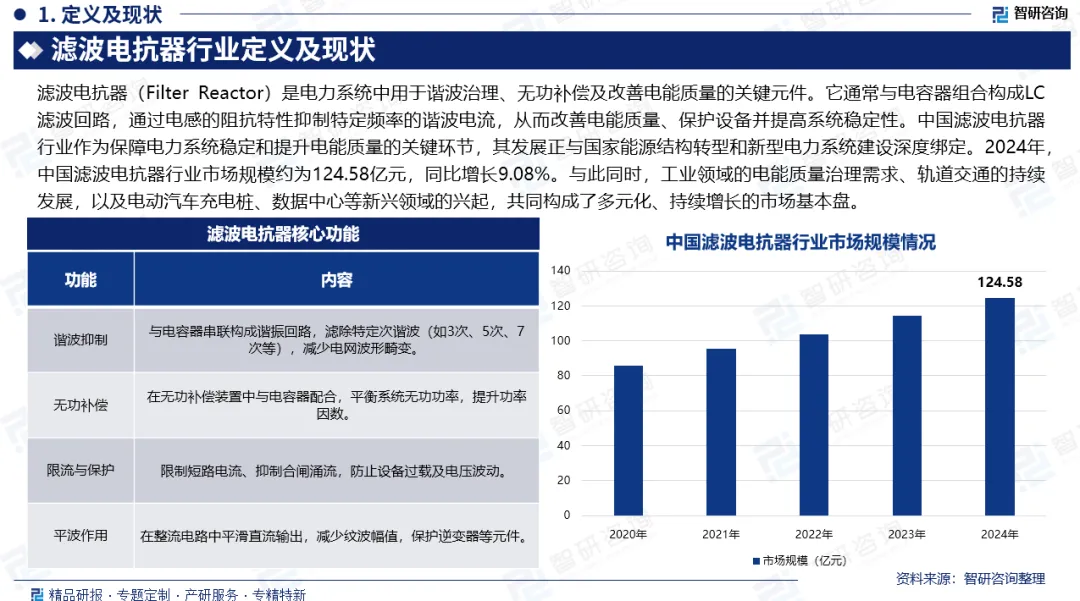 市场规模:中国滤波电抗器行业作为保障电力系统稳定和提升电能质量的关键环节,其发展正与国家能源结构转型和新型电力系统建设深度绑定。2024年,中国滤波电抗器行业市场规模约为124.58亿元,同比增长9.08%。与此同时,工业领域的电能质量治理需求、轨道交通的持续发展,以及电动汽车充电桩、数据中心等新兴领域的兴起,共同构成了多元化、持续增长的市场基本盘。