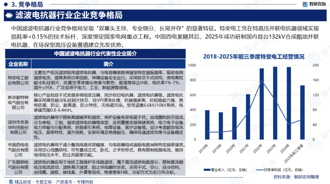 竞争情况:中国滤波电抗器行业竞争格局呈现"双寡头主导、专业细分、长尾并存"的显著特征。特变电工凭在特高压并联电抗器领域实现损耗率<0.15%的技术标杆,深度绑定国家电网重点工程。中国西电紧随其后,2025年成功研制国内首台132kV合成酯油并联电抗器,在环保型高压设备赛道建立先发优势。
