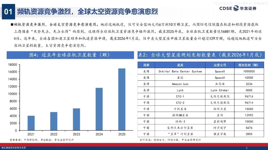 频轨资源竞争激烈,全球太空资源竞争愈演愈烈。地球近地轨道,仅可安全容纳大约6万到10万颗卫星,而国际电信联盟在轨道和频段资源获取上遵循着“先登先占,先占永得”的原则,这使得全球低轨卫星资源竞争格外激烈。截至2025年底,全球在轨卫星数量达16881颗,是2021年的近4倍。