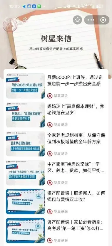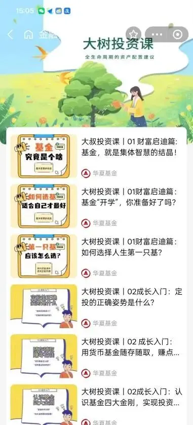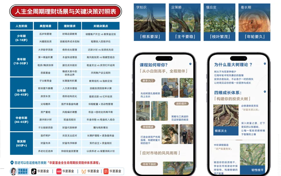 华夏基金推出了“全生命周期投资陪伴体系”,以“大树理论”为核心理念,将抽象的投资理论与升学、就业、成家、养老等真实人生场景深度融合,力争为投资者在每一个关键决策节点提供清晰、可操作的行动指南。