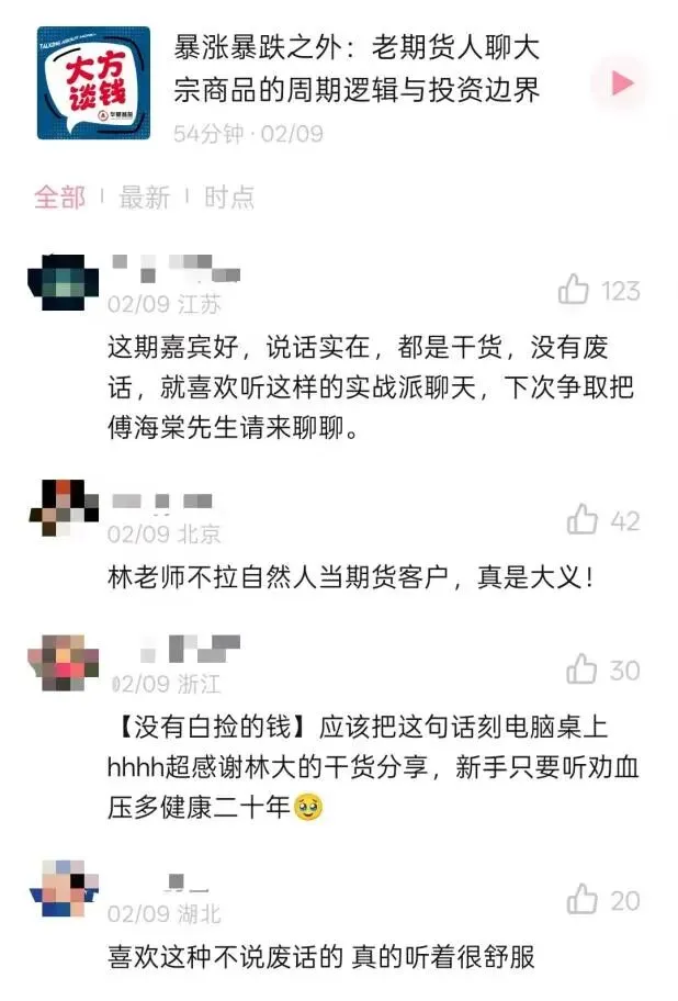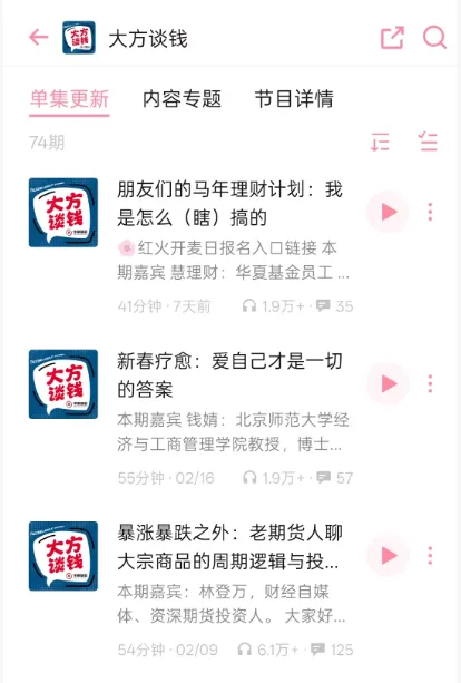 除了“看”,在做家务、开车的间隙听播客也成为不少人的新习惯,因此,我们推出品牌播客《大方谈钱》,为投资者提供更多样化的陪伴选择,播客内容覆盖产业、养老、公益、投资陪伴、策略方法等等,凭借充满活人感、人情味的访谈深受用户喜爱,平均完播率53%,粉丝数更是位列行业第一。