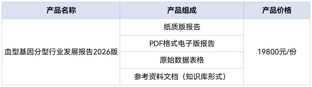 《血型基因分型行业发展报告2026》现已正式对外发布。产品由4部分组成,销售价格19800元/份。(表1)报告共分为十章(详见附录),全文超过5.5万字,包含表格35个、图片24张,力求系统、全面地呈现血型基因分型领域的发展现状与未来趋势。如您对该领域感兴趣,欢迎扫描下方二维码联系我们,我们将结合您的需求提供更全面的报告讲解。过去两年,《生物诊断》团队持续深耕体外诊断行业,建立了DataMed IVD数据中心,积累了资深专家资源,也打磨出一支专业化团队。自2026年起,团队正式承接体外诊断行业咨询业务,包括但不限于:前沿创新技术发展趋势与机会评估、企业发展战略咨询、产品立项评估、投融资竞调、园区招商策略支持等,如您有相关需求,可扫描下方二维码联系我们。[2] Xu LP, Lu PH, Wu DP, Huang H, Jiang EL, Liu DH, Cao WJ, Zhang X, Fu YW, Li NN, Chen XC, Zhu XY, Liu QF, Xia LH, Zhang YC, Xu YJ, Li FC, Hu J, Liu SX, Liu RR, Ma XD, Tang XW, Luo Y, Zhang XH, Huang XJ; Chinese Blood and Marrow Transplantation Registry Group. Hematopoietic stem cell transplantation activity in China 2022-2023. The proportions of peripheral blood for stem cell source continue to grow: a report from the Chinese Blood and Marrow Transplantation Registry Group. Bone Marrow Transplant. 2024 Dec;59(12):1726-1734.[3] 中国医师协会外科医师分会手术质量控制与评价专家工作组,楼文晖,刘颖斌,等.普通外科围手术期病人血液管理中国专家共识(2025版)[J].中国实用外科杂志, 2025, 45(3):241-248.