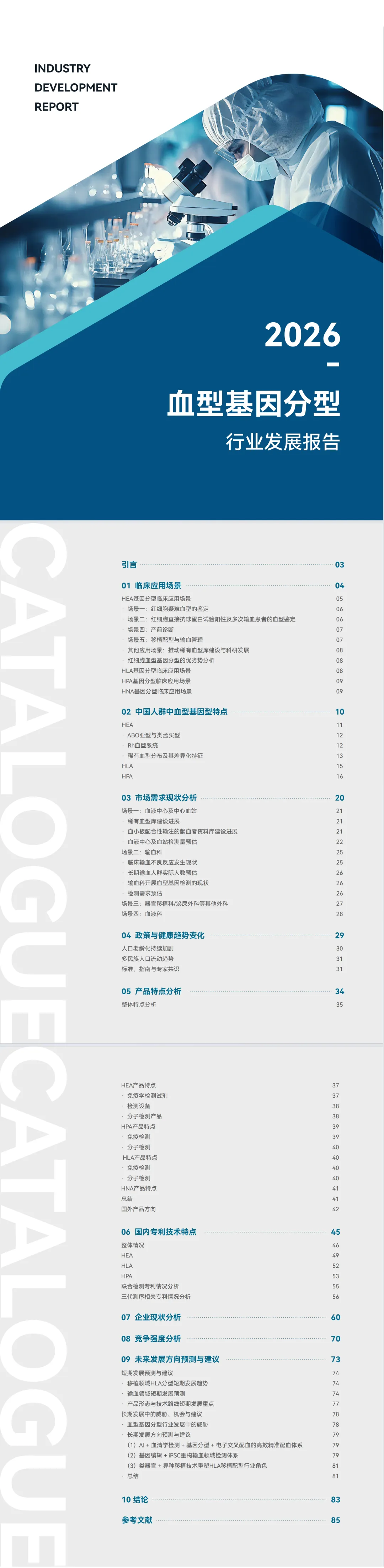为系统回应上述问题,全面呈现该领域的发展现状与未来趋势。自2025年11月起,《生物诊断》依托DataMed IVD数据中心,系统梳理了血型基因分型相关科研文献与书籍、招投标、专利及产品注册等多维度信息。历经初稿撰写、专家咨询、内部研讨及多轮修订,最终完成了《血型基因分型行业发展报告2026》的撰写。本报告旨在系统梳理血型基因分型在四大血液成分领域的临床应用场景与技术优势,深入分析中国市场的需求特征、竞争格局、产品管线与技术演进,并对行业短期发展路径与长期变革方向进行前瞻性探讨。(图3, 附录)