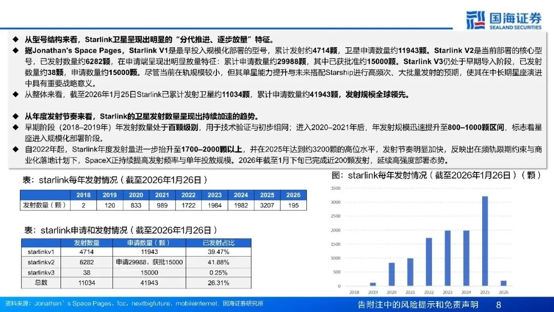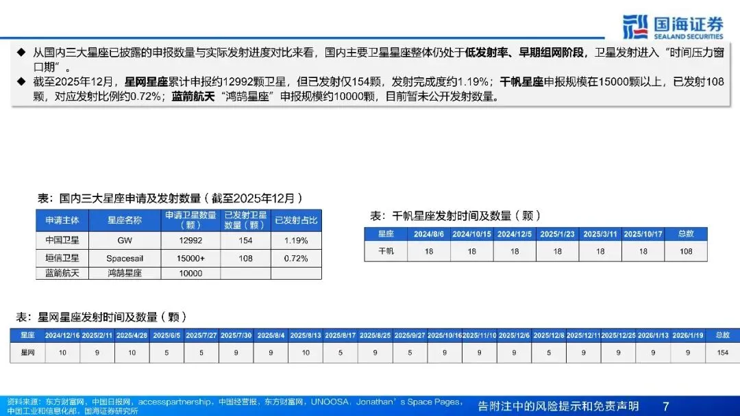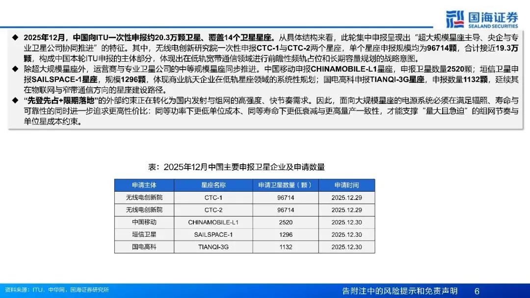 1)频轨先占,发射滞后:中国星座进入"时间压力窗口"。2025年年底,中国向ITU一次申报约20.3万颗卫星、覆盖14个卫星星座;其中无线电创新研究院集中申报CTC-1与CTC-2,单个星座各96714颗、合计接近19.3万颗。同时运营商与商业卫星公司推中等规模星座:中国移动申报2520颗、垣信卫星申报1296颗、国电高科申报1132颗。但截至2025年12月,国内头部星座披露口径下整体发射完成度仍较低,处于"低发率、早期组网阶段"