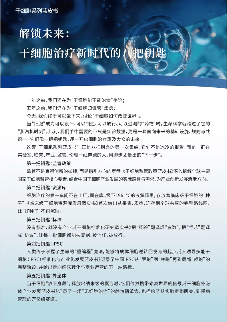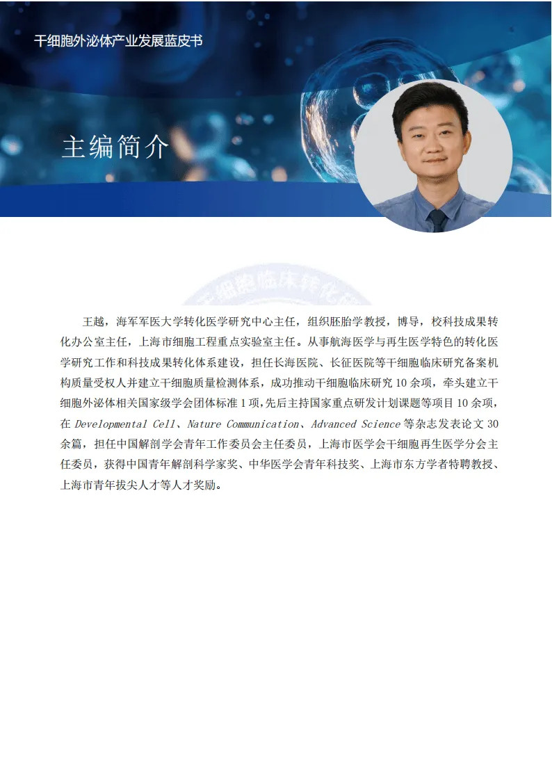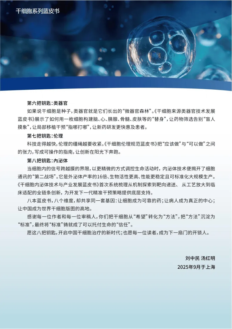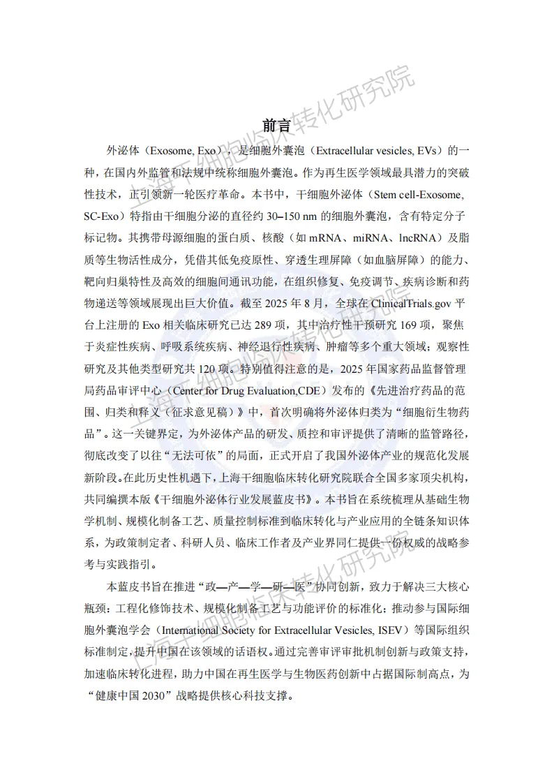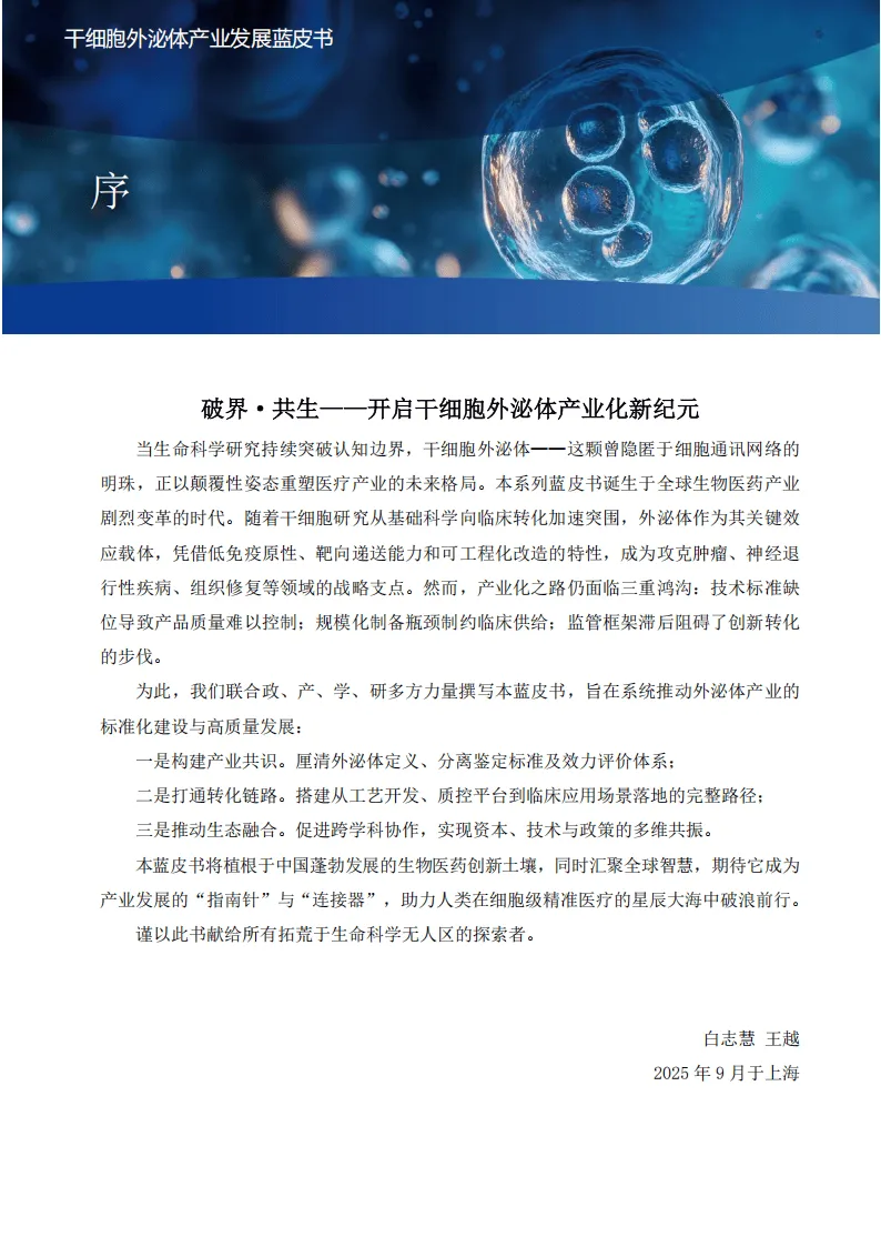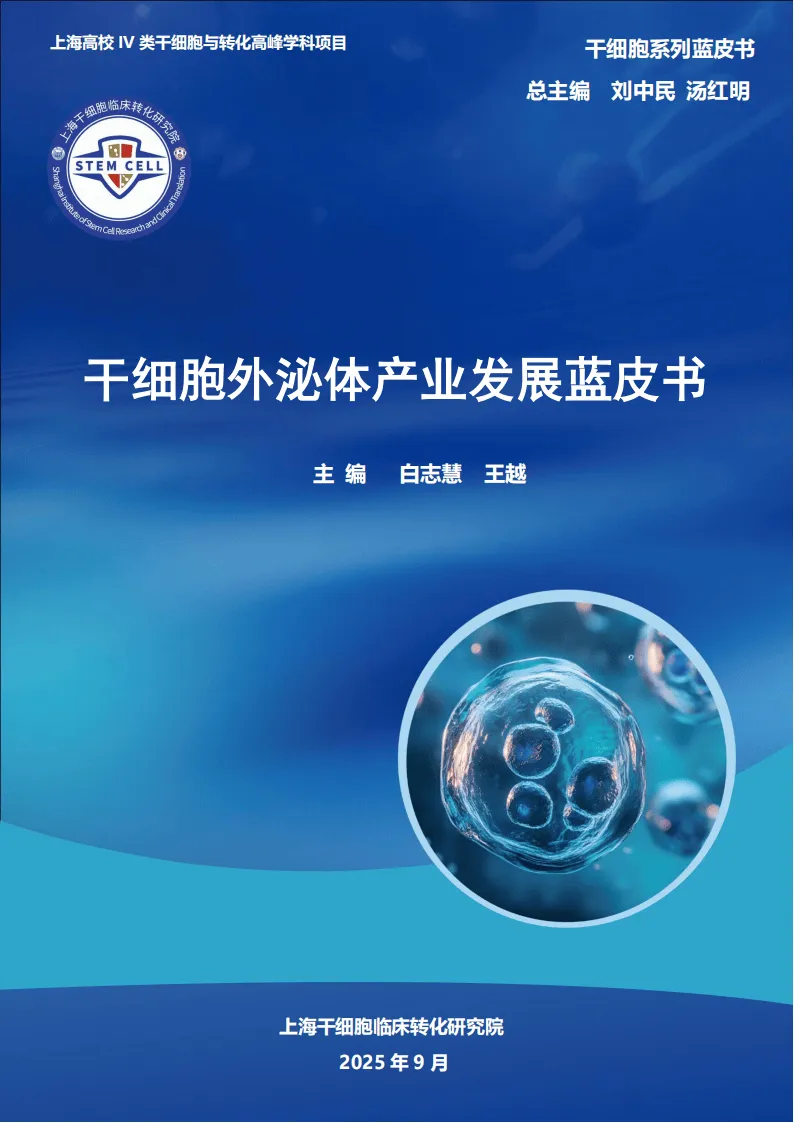 《2025干细胞外泌体产业发展蓝皮书》由上海干细胞临床转化研究院编撰,系统梳理了干细胞外泌体从基础研究到产业应用的全链条发展现状、核心问题与未来趋势,是该领域兼具权威性与实操性的战略参考。