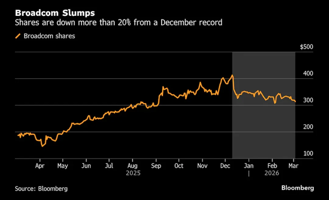 图表:博通股价暴跌 | 自12月创纪录高位以来,该股已下跌逾20%