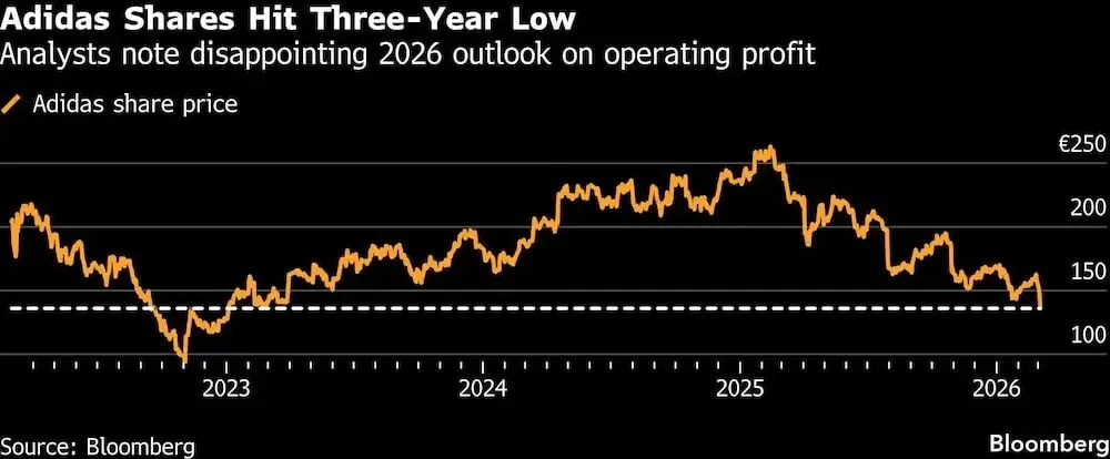 图表:阿迪达斯股价触及三年低点 | 分析师指出2026年营业利润前景令人失望