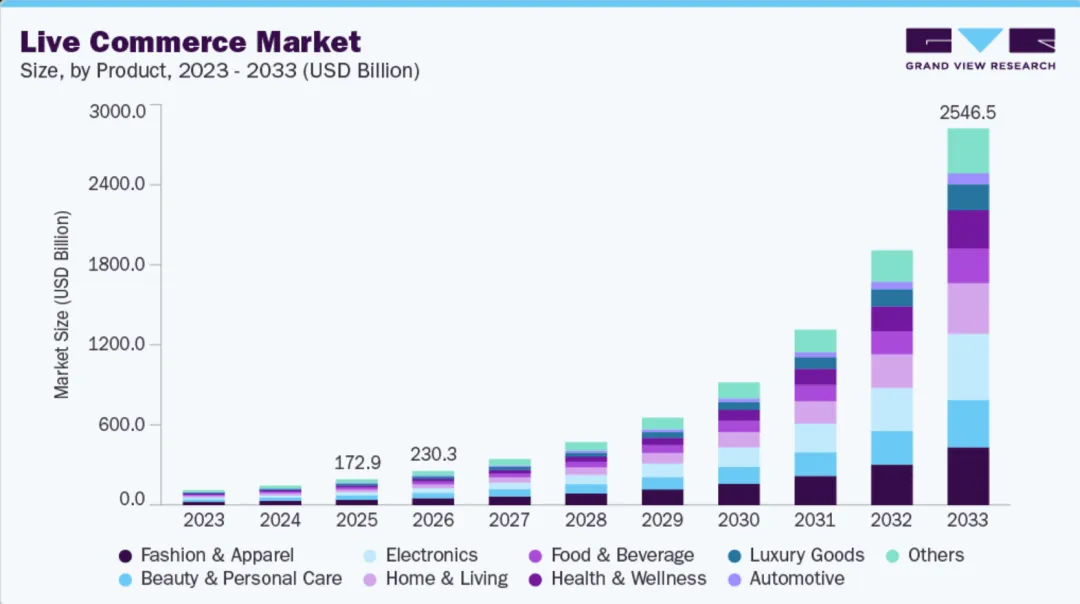 直播电商,正以短视频和实时互动为引擎,重塑全球零售格局。2025年全球直播电商市场规模已达172.86亿美元,2026年预计达到230.28亿美元,到2033年将飙升至2546.48亿美元,复合年增长率(CAGR)高达41.0%。这一爆炸式增长不仅源于中国直播电商GMV突破1万亿美元大关(2026年预计1.14万亿美元),更得益于TikTok Shop全球GMV从2025年的643亿美元跃升至2026年的1122-1683亿美元,年增长70-100%。