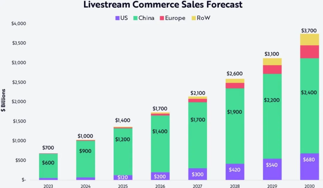 直播电商销售预测图,展示2023-2030年的区域增长,中国主导但全球爆发。